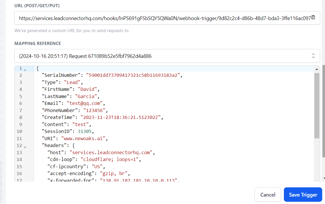 It might take couple of seconds to fetch leads information from , choose any lead from Mapping reference, the details of lead will show up in below section, then click "Save Trigger"