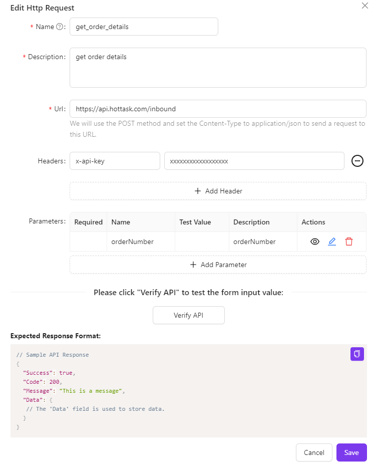 Click the “Verify API” button. If the interface operates correctly and returns the expected response, the validation will pass.